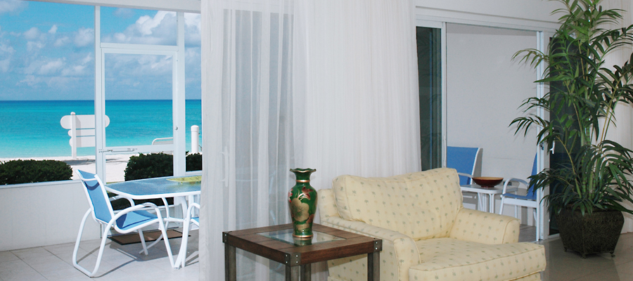 Condo 04 offers a spacious open air layout with panoramic views of Seven Mile Beach.