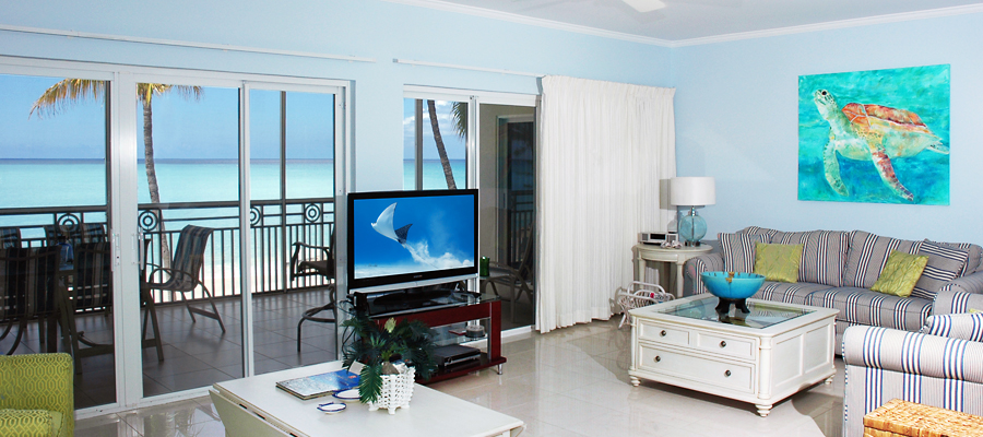 Condo 15 offers a spacious open air layout with panoramic views of Seven Mile Beach.